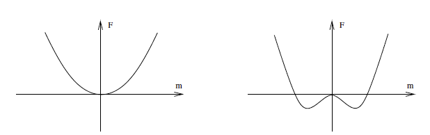 \[q_{EA} = \lim_{N\rightarrow\infty}{1\over N}\sum_i m_i^2\]and this is called the Edwards-Anderson order parameter. For $T> T_c$, $q_{EA}=0$, since the thermodynamic average $m_i=0$. If $T<T_c$ then $m_i$ can assume both positive and negative values, $-1\le m_i\le 1$ as in the Ising model. As a result $0\le q_{EA}\le 1$ for $T<T_c$. Hence spin glass models are characterized by $m = 0,\ 0\le q_{EA} \le 1$ for $T < T_c$.