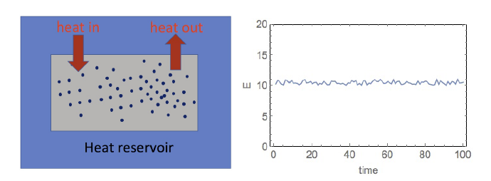 Up until this point, the discussion has been purely in terms of probability theory but now we are now going to use this to model a physical system consisting of gas particles. Consider a system consisting of large number of gas particles that is in equilibrium at a fixed temperature $T$. This can be achieved by putting the system in an infinite heat bath at temperature T, and assuming that it can exchange energy, but not particles, with the heat bath (see above figure, such a system is called a canonical system in thermodynamics). The energy $E$ of the system is not fixed, but can fluctuate as shown in the right hand side of the figure. This fluctuation is due to the energy exchange with the heat bath required to maintain the temperature at a constant value T. Clearly every particle does not have the same energy level as a result of the heat exchange and since we can’t track each and every particle, all we can do is work in terms of the distribution of energies. Hence we have introduced some ‘fuzziness’ in our knowledge of the system.