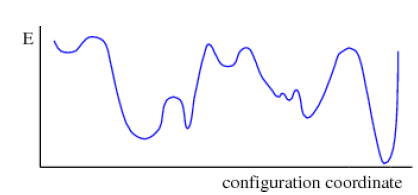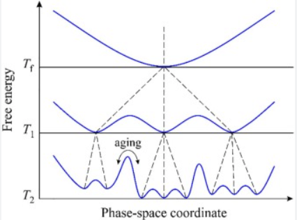 - An even further reduction in the temperature causes more replica symmetry breaking, as a result of which we now see that each of the pure states from the second stage have further split into multiple pure states lying within the energy valley formed in stage 2. Furthermore the overlap distribution has developed a peak near 1, which implies that at low temperatures each pure state converges to its single configuration with a low degree of overlap with the other configurations (blue curve). In this situation the self overlap becomes equal to 1, while the cross overlap between states is zero. This process is completely probabilistic, so the system may end up in a different configuration every time it is gradually frozen.