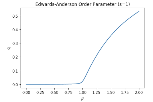 The above figure shows the variation of $q_{EA}$ with the inverse temperature in the SK model for the case $T_c=1$. As shown $q_{EA}$ goes to one in the limit as $T\rightarrow 0$,