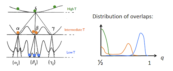 - As the temperature is reduced below the critical value, we see the formation of multiple pure states and there is split of the of overlap distribution into a bi-modal shape (orange curve). Configurations can be in the same pure state in which case they have a high overlap value $q_1$, or they can be in different pure states, in which vase the overlap tends to be smaller at $q_0$.