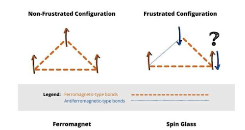 In the last few decades statistical mechanics has been extended to non-traditional systems, and one of these is to a type of material called a spin glass. These are made in the lab by creating an alloy of a conducting material such as copper and small amounts of a magnetic materials such as iron. When the temperature is decreased, the magnetic material tries to align all its spins in the same direction, but is prevented from doing so by the surrounding conductor. This complicates the interaction between nearby spins, since a spin can be simultaneously subject to forces that try to align it in opposite directions, which is a phenomenon called ‘frustration’. Frustration causes the spin orientation of an atom to be randomly oriented even at very low temperatures, and one consequence of this is that the phase change behavior of these materials is very different than that for ferromagnetic materials. Whereas a ferromagnet only has two phases, a spin glass exhibits hundreds of thousands of phases as the temperature is progressively reduced. It turns out that this is a very interesting property that has been exploited by both biological systems, as well as man-made systems that mimic biological systems such as neural networks. In order to understand why this is the case, consider the following: