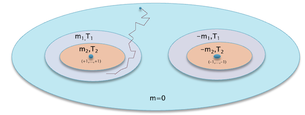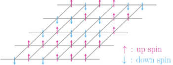 The system we shall consider is the same as shown in figure 2, except that instead of a gas we have a $N$ atoms that are fixed in place, and can be in one of two states, with spin $+1$ or $-1$. But we still have the thermal heat bath at temperature $T$ that transfers heat energy into the system and thus causes the spin values to become dis-ordered.