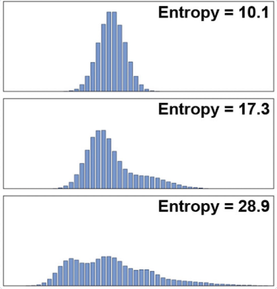 \[S(p_1,p_2,...,p_n) = -\sum_i p_i \log p_i \ \ \ \ \ \ \ \ \ \ \ \ \ \ \ \ \ \ \ \ \ \ \ \ \ \ \ \ \ \ \ \ \ \ \ \ \ \ \ (2)\]He called this quantity the entropy of the probability distribution (note that since all the $p_i \le 1$, $S$ is always a non-negative quantity). This definition agrees with the intuitive notion that more “spread out” a distribution is, the higher is its entropy (the above figure illustrates the increase in entropy with the spread of the probability distribution). For example if $x$ is known with certainty then $S=0$ which is its minimum value, and conversely if nothing is known about $x$, then the probabilities are all equal and given by $p_i = {1\over n}, i=1,2,…n$, which results in an entropy of $S=\log\ n$ which is its maximum value. This also implies that if nothing is known about a system other than its entropy $S$, then the approximate number of microstates in the system is given by $e^{S}$.