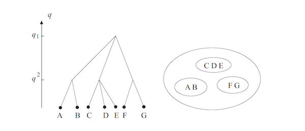 Another way to visualize replica symmetry breaking is shown in the above figure. At high temperatures we have single pure state, as shown by the large oval (which can be thought to be the space of all configurations) on the right and the top node in the tree. When the temperature dips below $T_c$ the state splits into three pure states as shown by the three smaller ovals which are now restricted to a smaller subset of configurations. A further reduction in temperature causes these 3 pure states to split into 6 pure states, each with a even smaller set of possible configurations. The overlap function $q_{\alpha\beta}$ depends on how far the pure states $\alpha$ and $\beta$ are from each other in the tree structure. For example A and B are closer to each other, and further away from the other states C,D,E,F and G.