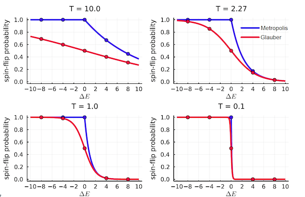 Plotting the Boltzmann distribution as a function of the state is a difficult proposition, since the state is multi-dimensional with thousands of dimensions in realistic models. However it can also be plotted as a function of the energy levels $E$, so instead of considering the probability of the system being in state $i$, we instead consider the probability of the system being in a state with energy $E$. For example in the above figure the Boltzmann distribution is plotted for the Ising model at four different temperatures (in blue). We can see that as the temperature increases the distribution moves towards the right, as more energetic states become more probable. Hence given the temperature we cannot say for sure what state the system is in or what energy it has, but we can estimate the probability of this happening, which is sometimes referred to as ‘blurry’ view of the system. Also the sharp peak in the distribution is evident in these curves, which implies that is a configuration is chosen at random (the red curve) then the probability that it will belong to one of the allowed configurations for a given value of $T$ is zero. If so, how would we go about obtaining the configurations in the Ising model if the system were to be simulated on a computer? There are a couple of ways for doing this, namely the Metropolis and Glauber algorithms, and these are described in a following section.