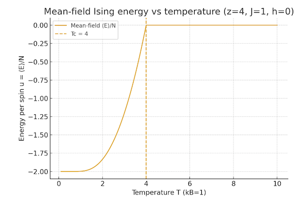 If this had been the usual description of statistical mechanics, then at this point I would have introduced the model for an ideal gas, and then apply the formulae that we just derived to compute its average energy and entropy etc. But we are going to take a slightly different tack and focus on the Ising model for ferromagnetism instead. This system is less complex than the ideal gas, since the atoms are fixed in place rather than zipping around in space, but at the same time it enables us introduce the concept of interaction between atoms in a simpler way than for the case of a gas. In particular coupling between atoms leads to phase transitions which can be demonstrated in the Ising model without getting into very complex analysis.