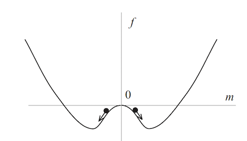 \[E = -{1\over{2}}\sum_i \sum_j s_i s_j = -{1\over{2}}\sum_i \sum_j \xi^1_i\xi^1_j\sigma_i\sigma_j\]But this is precisely the energy for a Hopfield network for the case when $p=1$. We have just shown that such a Hopfield network (with variable spin interactions), also called a Mattis network, is equivalent to an Ising model (with fixed spin interaction $J=1$) with spins $s_i = \xi_i^1\sigma_i$. Well not quite, in an Ising model each spin only interacts with its immediate neighbors, while in the Mattis model each spin interacts with every other spin. Fortunately an analysis of this system is quite straightforward and results in the the same equations for the free energy $f$ and order parameter $m$ as the regular Ising model.