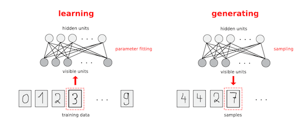An example of how a Boltzmann machine can be put to use is shown in the above figure. The data consists of handwritten images of numerals from 0 to 9, and these are digitized using a $28 x 28$ grid using 0 for white and 1 for black. Any one of the numerals can be written down as a 784 dimensional vector of ones and zeroes, say $(x_1,…,x_{784})$. The elements of these vectors are distributed according to some unknown distribution $p_X(x_1,x_2,…,x_{784})$ and all we have are samples from this distribution. The Boltzmann machine can be trained using these samples, and it is able to create a representation for this distribution in its node interaction parameters, as shown in the left hand part of the figure. Once the training is complete, it can be used to generate new patterns that confirm to the distribution that it has learnt as shown on the right hand side.
