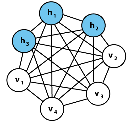 An example of a Boltzmann machine is shown in the above figure. It has a a fully connected topology as in the Hopfield network, with the ‘spin’ at each node taking on values of 0 or 1. The energy $E$ is also identical to that in the Hopfield network, given by