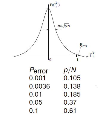 \[P_{error} = P(C^\mu_i > 1) \approx {1\over 2}(1-erf(\sqrt{N\over{2p}}))\ \ \ with\ \ \ erf(x) = {1\over\sqrt{\pi}}\int_0^x e^{-s^2} ds\]
