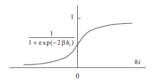 \[h_i(t) = \sum_j J_{ij}\sigma_j(t)\]and assume that $\sigma_i(t+\Delta t)$ becomes 1 with probability $1\over{1+e^{-2\beta h_i(t)}}$ and -1 with probability ${e^{-2\beta h_i(t)}\over{1+e^{-2\beta h_i(t)}}}$, where $\beta = {1\over T}$ is the inverse temperature (see above figure). Note that this stochastic dynamics reduces to earlier state transition equation in the limit $\beta\rightarrow\infty$ so that the original Hopfield Network corresponds to the case $T=0$, since $\sigma_i(t+\Delta t) = 1$ if $h_i(t) > 0$ and is $\sigma_i(t+\Delta t) = -1$ otherwise. On the other hand the network becomes completely random if $T=\infty$. From our knowledge of statistical mechanics, we know that if the system is allowed to evolve then ultimately it will settle down to a set of states whose probabilities are distributed according to the Boltzmann distribution.