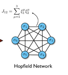 Hopfield started with a SK type spin glass model with full connectivity, as shown above, with the symmetric interaction between nodes $i$ and $j$ given by $J_{ij}$. Assume that the spin at each node, $\sigma_i, i = 1,2,…N$ in the network can assume values of +1 or -1, and denote the state $X$ of the network as $\Sigma = (\sigma_1,…,\sigma_N)$. Furthermore assume that the state of the network evolves according to the equation