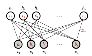 \[E(v,h) = -\sum_{i=1}^H\sum_{j=1}^V w_{ij} h_i v_j - \sum_{i=1}^H b_i h_i - \sum_{j=1}^V c_j v_j\]The benefit of having this bi-partite structure is that that hidden node spins are independent given the visible node spins and vice versa, i.e.,