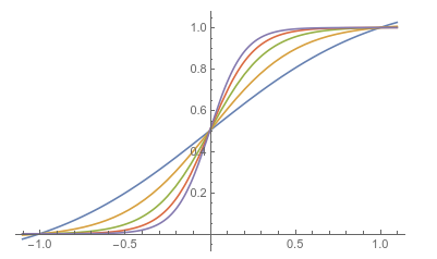 \[p(\sigma_k = 1) = p_k = {1\over{1 + \exp(-\beta h_k)}}\]and this is irrespective of its previous state. As $T\rightarrow 0$, this rule becomes the Hopfield rule, while as $T\rightarrow\infty$ the assignment becomes completely random. The above figure plots $p_k$ for various values of $T$.