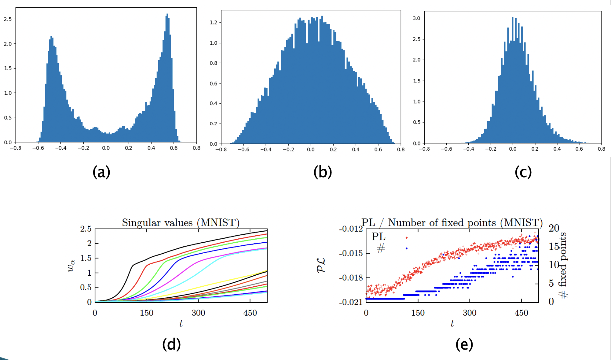 The above figure shows experimental data collected while the RBM was being trained on MNIST data. The top part of the figure plots the histogram of the distances between the weight values for three different cases during the course of training. When the training starts the weights are initialized to random Gaussian values and hence the histogram of distances is also Gaussian and centered at zero which puts the RBM in the paramagnetic phase. As the training proceeds the RBM enters the ferromagnetic phase and the eigenvalues assume a structure in which there is a dominant mode and this results in high positive or negative inter-weight distance as shown in part (a). This is also seen by directly plotting the eigenvalues, as shown in part (d), we can see that the ‘blue’ eigenvalue has assumes larger values while the others are still small. The resulting samples from the RBM don’t look very different than the ones that were used for training. Part (b) shows the inter-weight values after further training has taken place. Part (d) of the figure shows that many more modes have emerged and the histogram of distances is much broader, but the generated samples still correspond closely to the training data with not much variation. After further training the RBM becomes fully trained and starts to generate a variety of good samples. In this case the eigenvalues are close to each other as seen in part (d) of the figure, while the inter-weight distance is still centered at zero, but with a much smaller variance, as shown in part (c). Part (e) of the figure shows the number of fixed point of the mean field equations for the RBM, and these correspond to the number of patterns that it can produce. We can see that starting from zero in the paramagnetic phase, the number of fixed points progressively increases as the training goes on, and it actually exceeds the number of MNIST classes if continued for a long time.